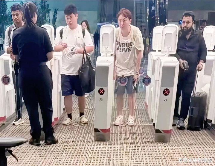 照片里,他顶着一头时尚的红发,因为安检机器的高度问题,不得不半蹲着身子去扫脸。